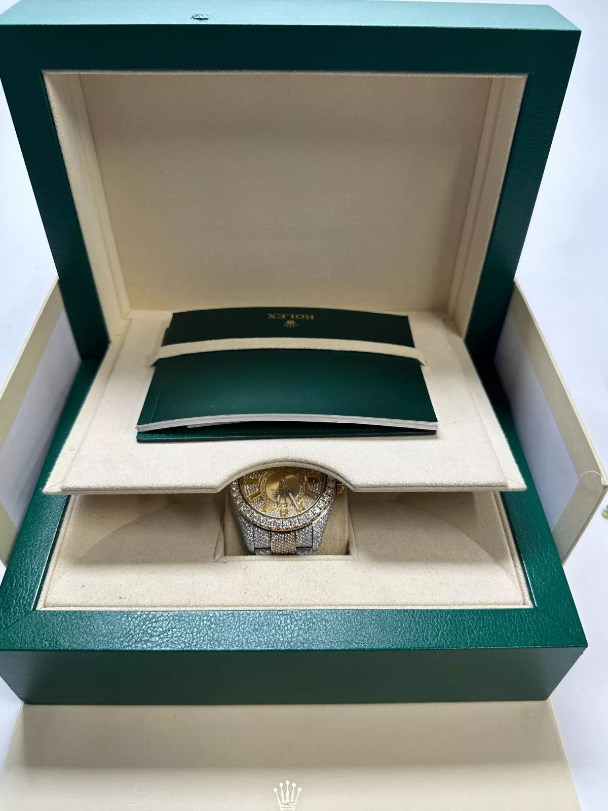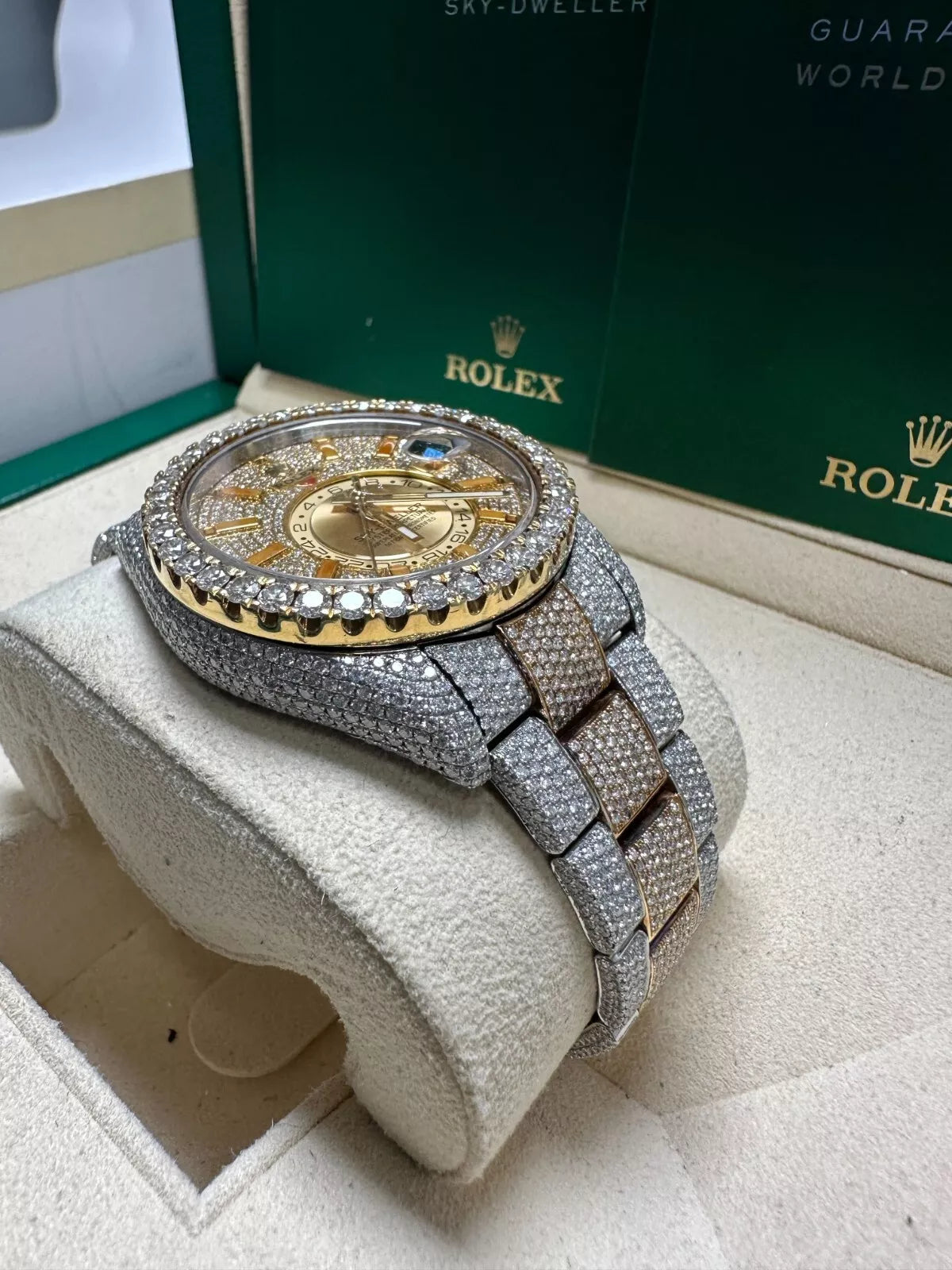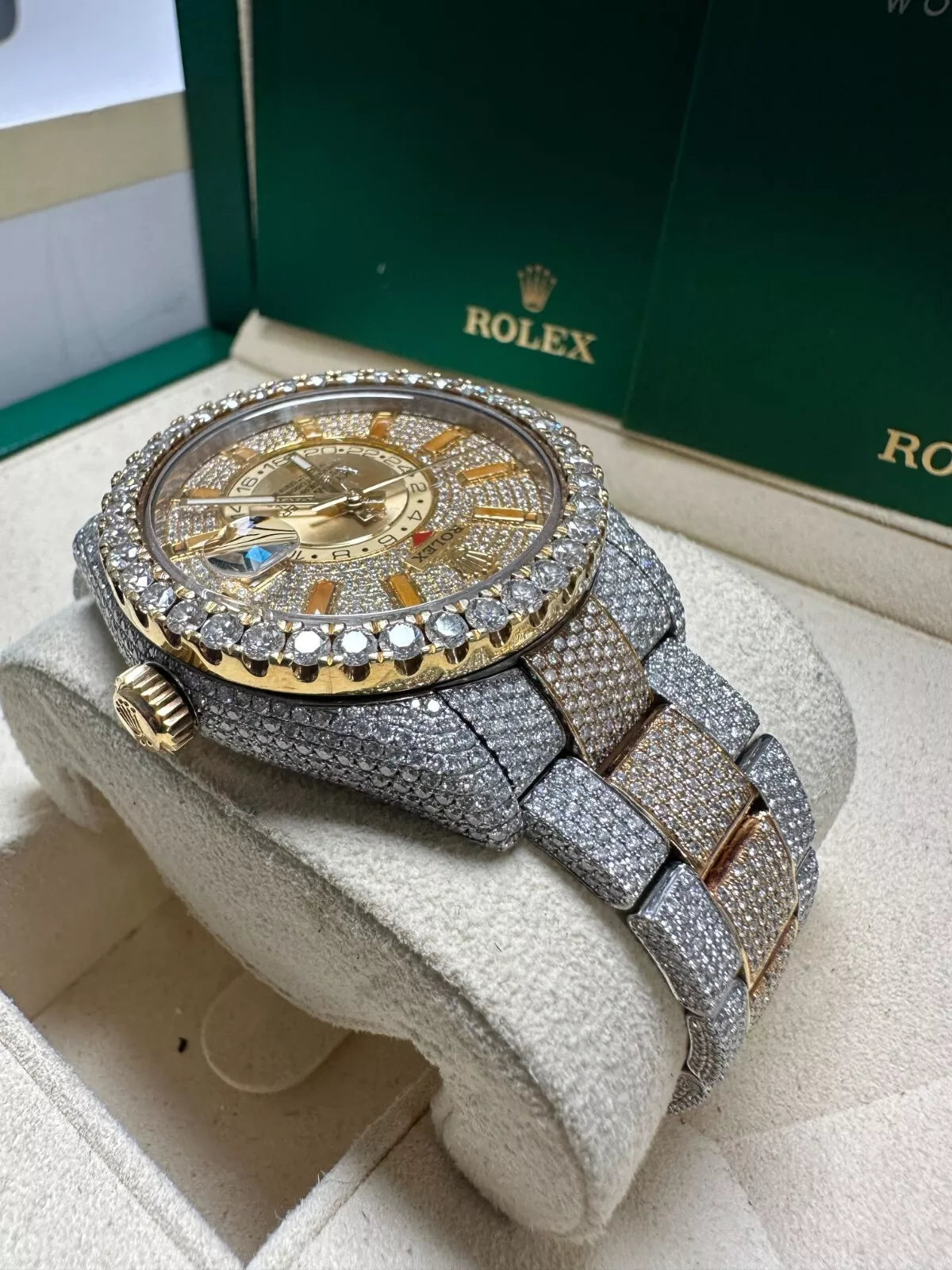 Own a stunning and customized 2017 Rolex Sky-Dweller, featuring a full "iced-out" diamond finish and a luxurious two-tone design. This high-end timepiece is an exceptional statement piece for collectors and watch enthusiasts alike.