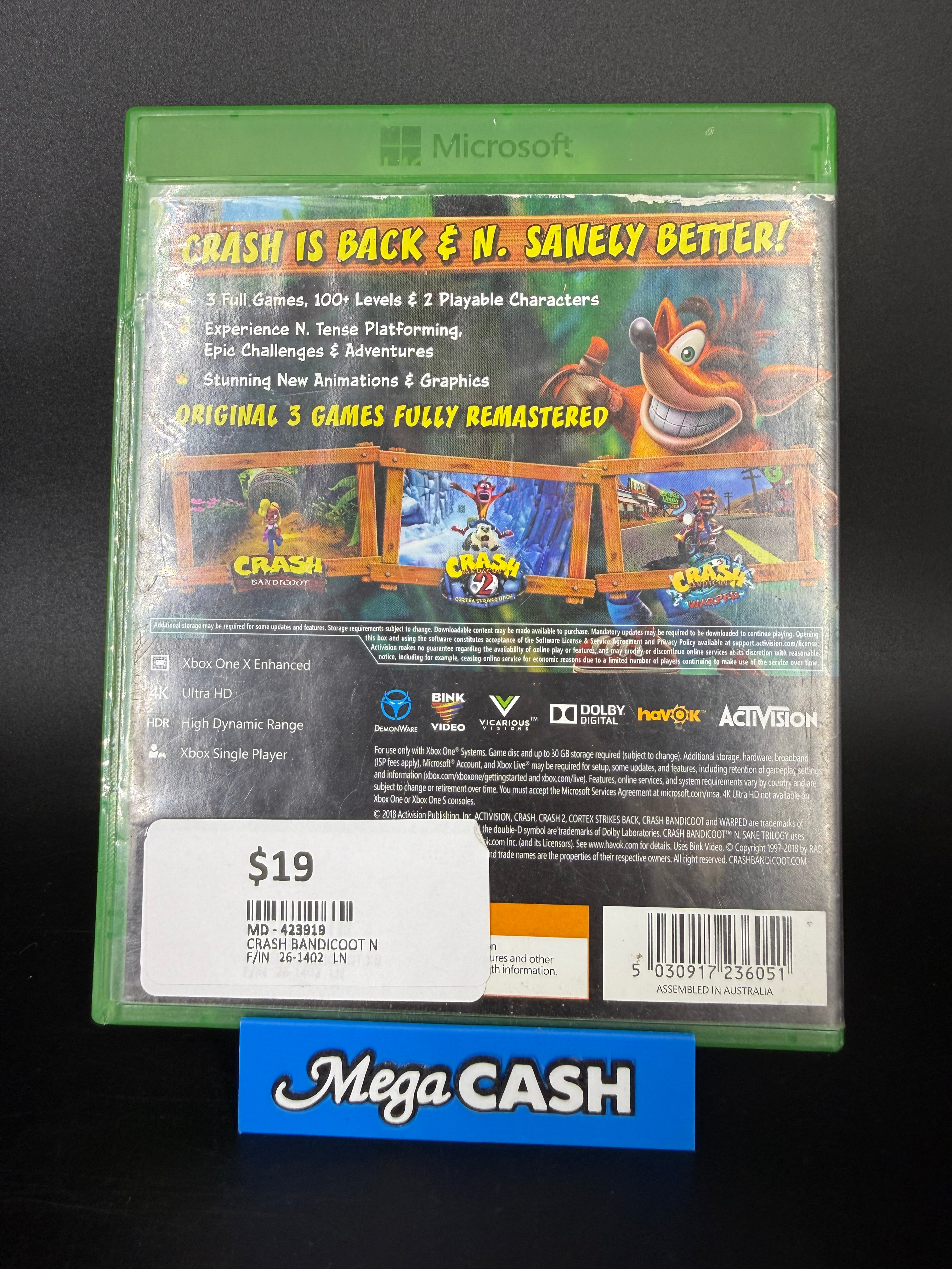 Crash Bandicoot: N-Sane Trilogy for Xbox One in good preowned condition. Fully tested and working perfectly. This classic platformer trilogy features enhanced graphics and gameplay across all three original games. Ideal for collectors and fans seeking an affordable way to experience this beloved franchise. Fast Shipping.
