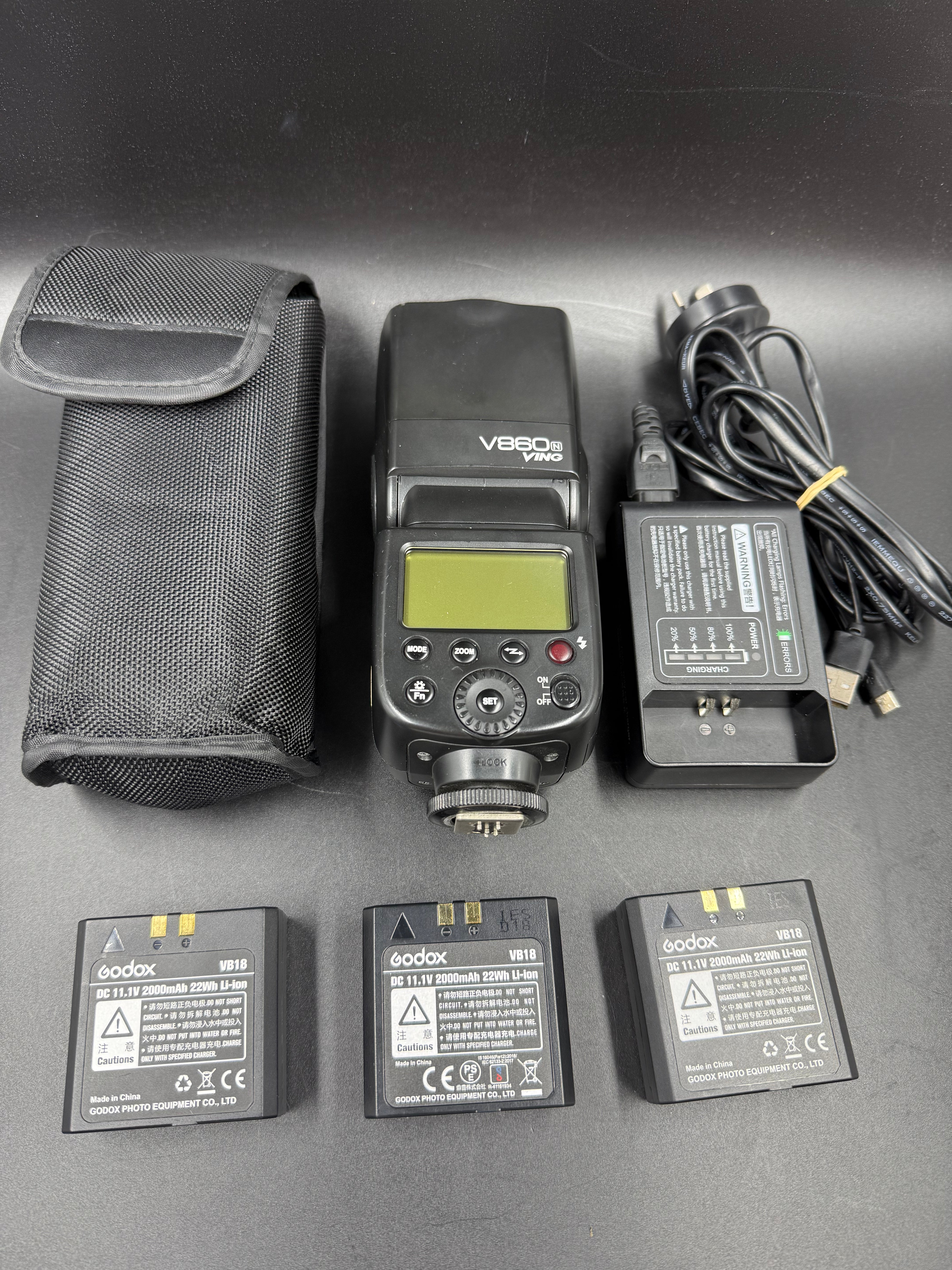 Godox V860 N Flash for Nikon—good preowned condition. This powerful speedlight delivers reliable performance for professional and enthusiast photographers. Includes protective case, charger and three batteries, ready to use. Perfect for studio work, events, and creative lighting setups. Tested and fully functional.